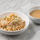Giant Couscous dough pearls with chickpeas, and braised baby onions broth. Topped with tender pulled chicken.